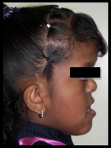 "La paciente parecía ser bien integrada, se la veía sana e inteligente, pero tenía dificultad para hablar. En su visita inicial tenía un tamaño de 100 cm de estatura. El examen extraoral reveló manifestaciones clásicas asociadas con la acondroplasia como ser: baja estatura, manos cortas y en tridente, prominencia frontal, puente nasal hundido, hipoplasia severa de la cara media y labios incompetentes. Se observó respiración bucal, brecha interlabial de aproximadamente 12 mm en reposo y una mente hiperactiva. El cierre de los labios no fue posible sin tensión muscular. También fue observado un perfil facial cóncavo, sin embargo, la mandíbula parecía normal y la barbilla no era prominente."